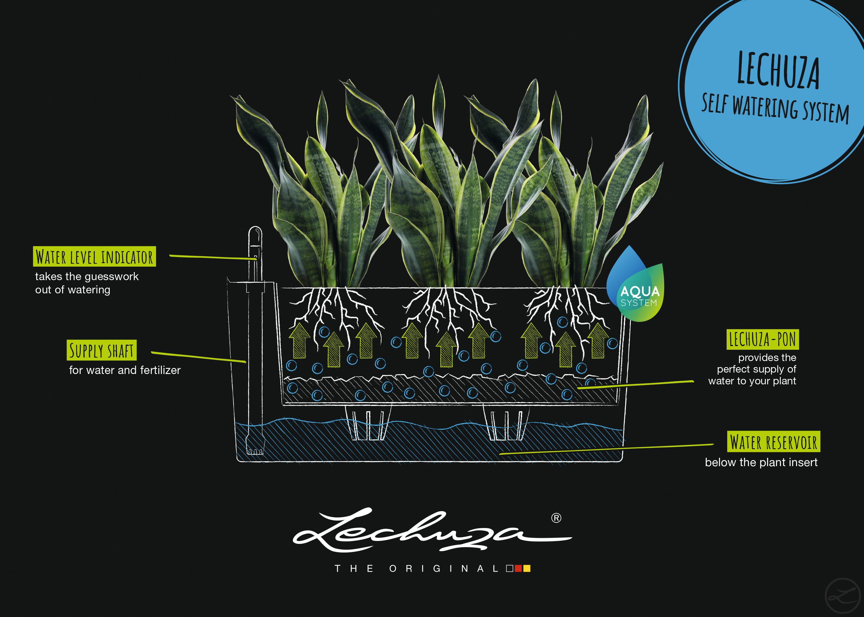 Donice Lechuza wykonane są z wysokiej jakości pierwotnego surowca – polipropylenu, którego poddano lakierowaniu. Dzięki temu uzyskano, w zależności od koloru efekt optyczny metalu, bądź szlachetnej ceramiki. Donice odporne są na wszelkie warunki pogodowe, opady deszczu i śniegu, mróz do -30°C, poza tym charakteryzują się odpornością na promieniowanie UV, przez wiele lat zachowując niezmienny wygląd. Donice odporne są na pęknięcia, złamania i stłuczenia. Donice Lechuza są uniwersalne, mają zastosowanie wewnątrz i na zewnątrz budynków. Doskonale pasują do wnętrz biurowych, gabinetów, hoteli, obiektów użyteczności publicznej, domów, mieszkań i apartamentów. Donice Lechuza są wyjątkowo lekkie, nie obciążają nadmiernie stropów, balkonów, tarasów, zielonych dachów. W dnie donicy znajduje się otwór odpływowy wraz ze śrubą, którą odkręcić można przy pomocy zwykłej monety. Dzięki otworowi możliwy jest odpływ nadmiaru wody powstały podczas przelania przy podlewaniu lub intensywnych opadów atmosferycznych. Donice przeznaczone są do uprawy roślin zarówno w ziemi jak i w substracie mineralnym. Dzięki substratowi LECHUZA-PON roślinie zapewnione jest utrzymanie optymalnej wilgotności podłoża. Donice przystosowane są do uprawy roślin hydroponicznych. System nawadniający zintegrowany z donicą gromadzący zapas wody na jej dnie, pozwala na dużo rzadsze podlewanie roślin. Donice Lechuza umożliwiają sadzenie dużych, nawet kilkumetrowych roślin. Donice można pozostawić cały rok na zewnątrz, jeśli tylko rośliny w nich nasadzone są mrozoodporne i zabezpieczone odpowiednio przed silnymi mrozami. Rośliny w dużych donicach mogą być mobilne poprzez zastosowanie niewidocznych podstawek z kółkami, które stanowią dodatkową ofertę producenta. Przy obsadzaniu dużych donic kolumnowych zalecane jest dodatkowe obciążenie donic od wewnątrz, aby uniknąć wywrócenia ich przy silnych i porywistych wiatrach.