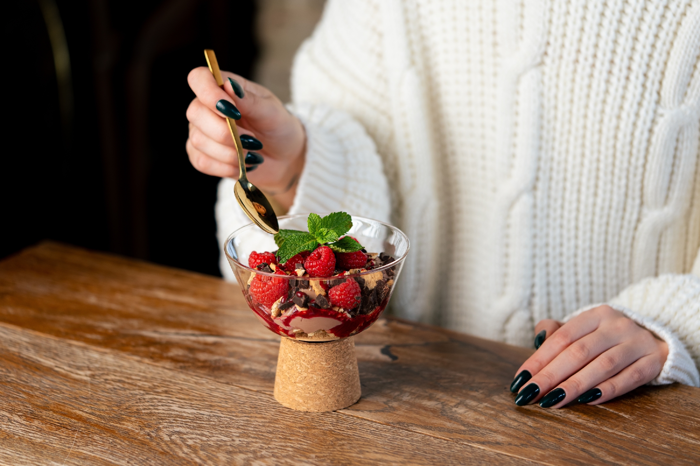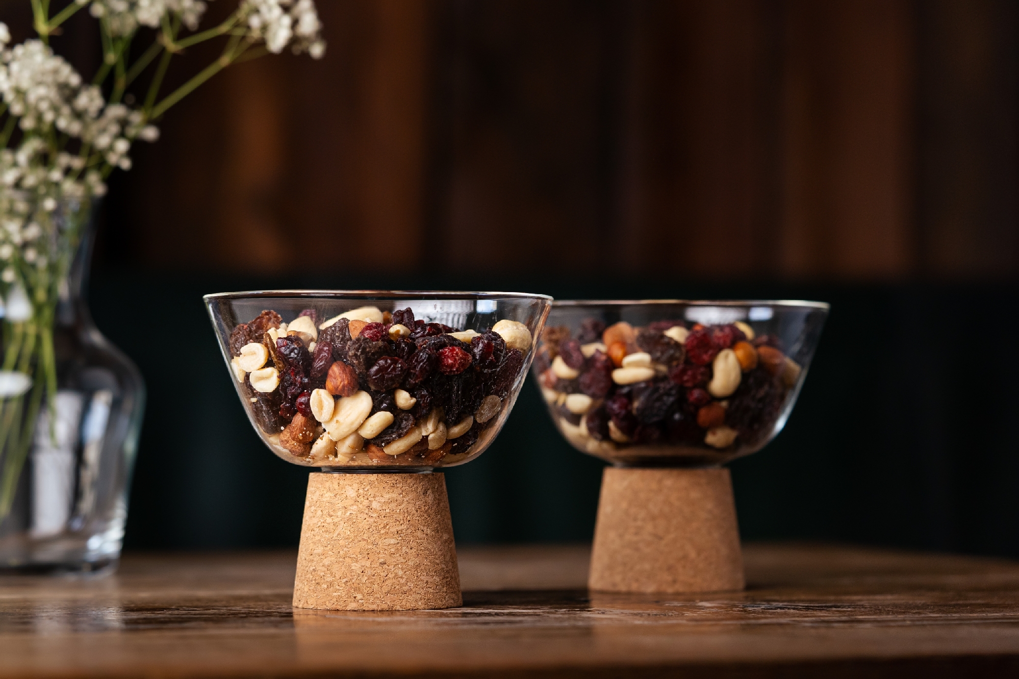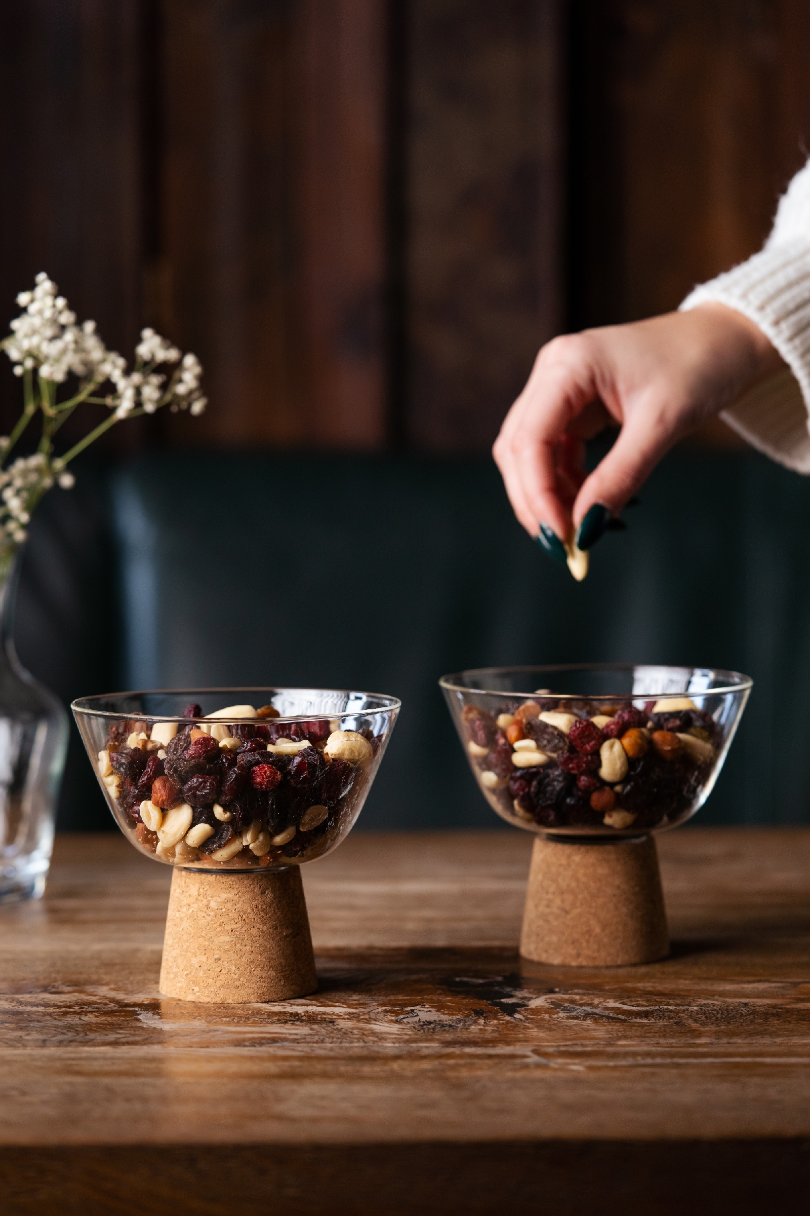 Miseczki wyposażone są w zdejmowalne korkowe podstawki, które zapewniają stabilność i dodają naturalnego uroku. To praktyczne rozwiązanie nie tylko chroni powierzchnie stołów, ale także nadaje zestawowi nowoczesny, elegancki charakter.