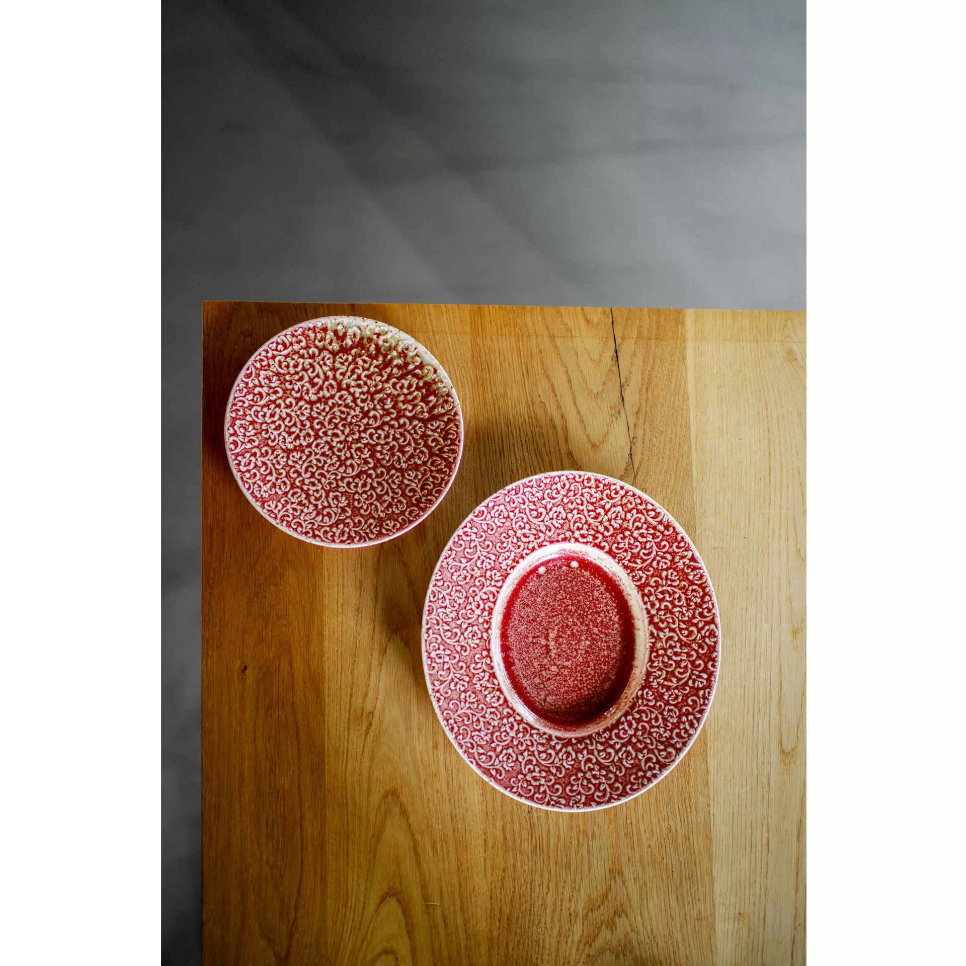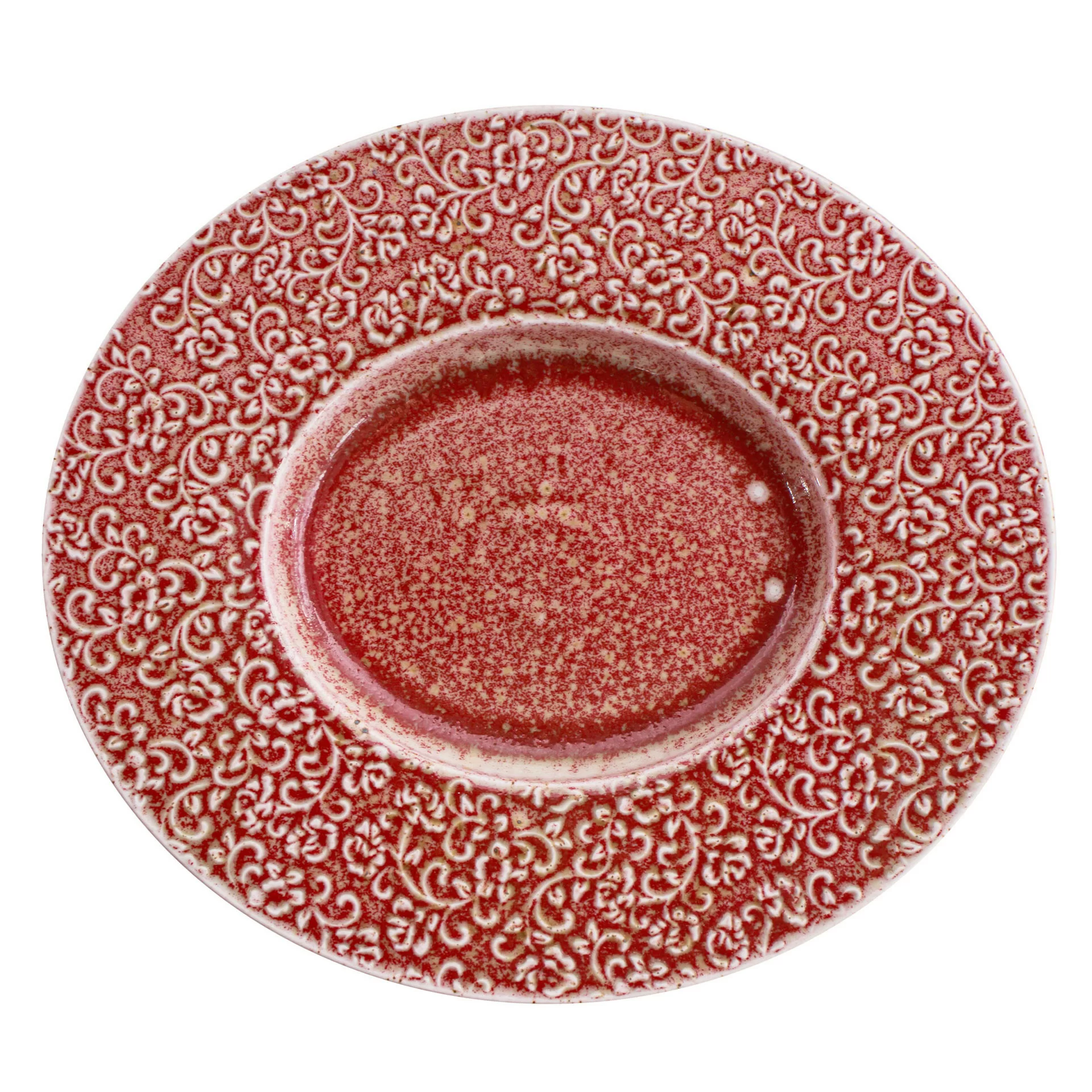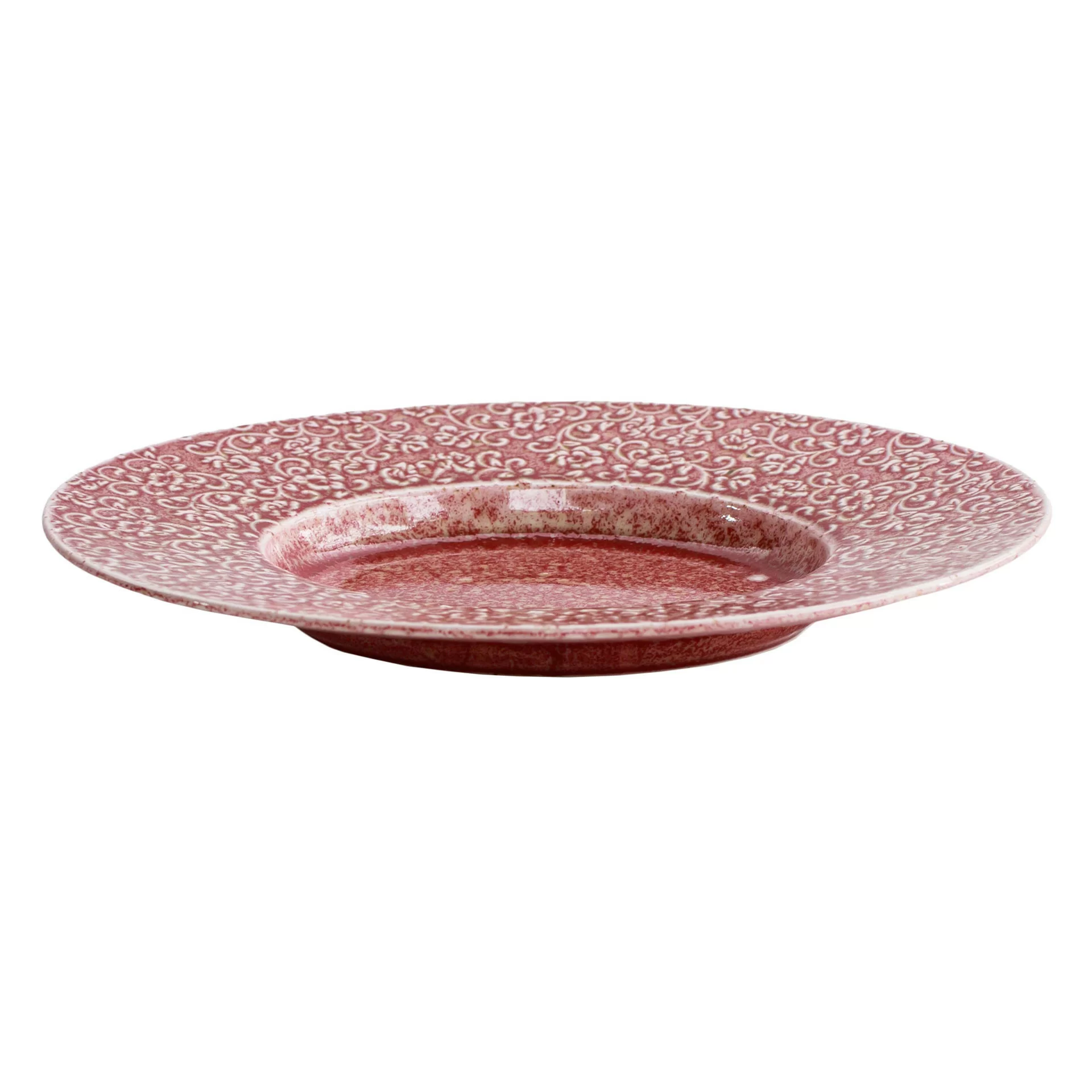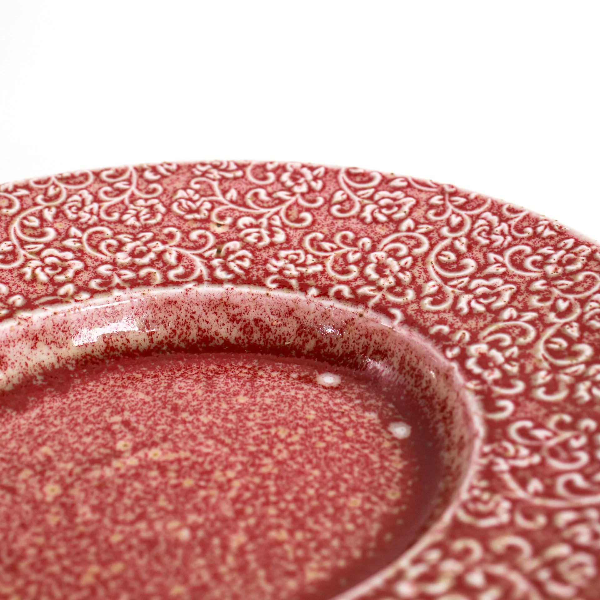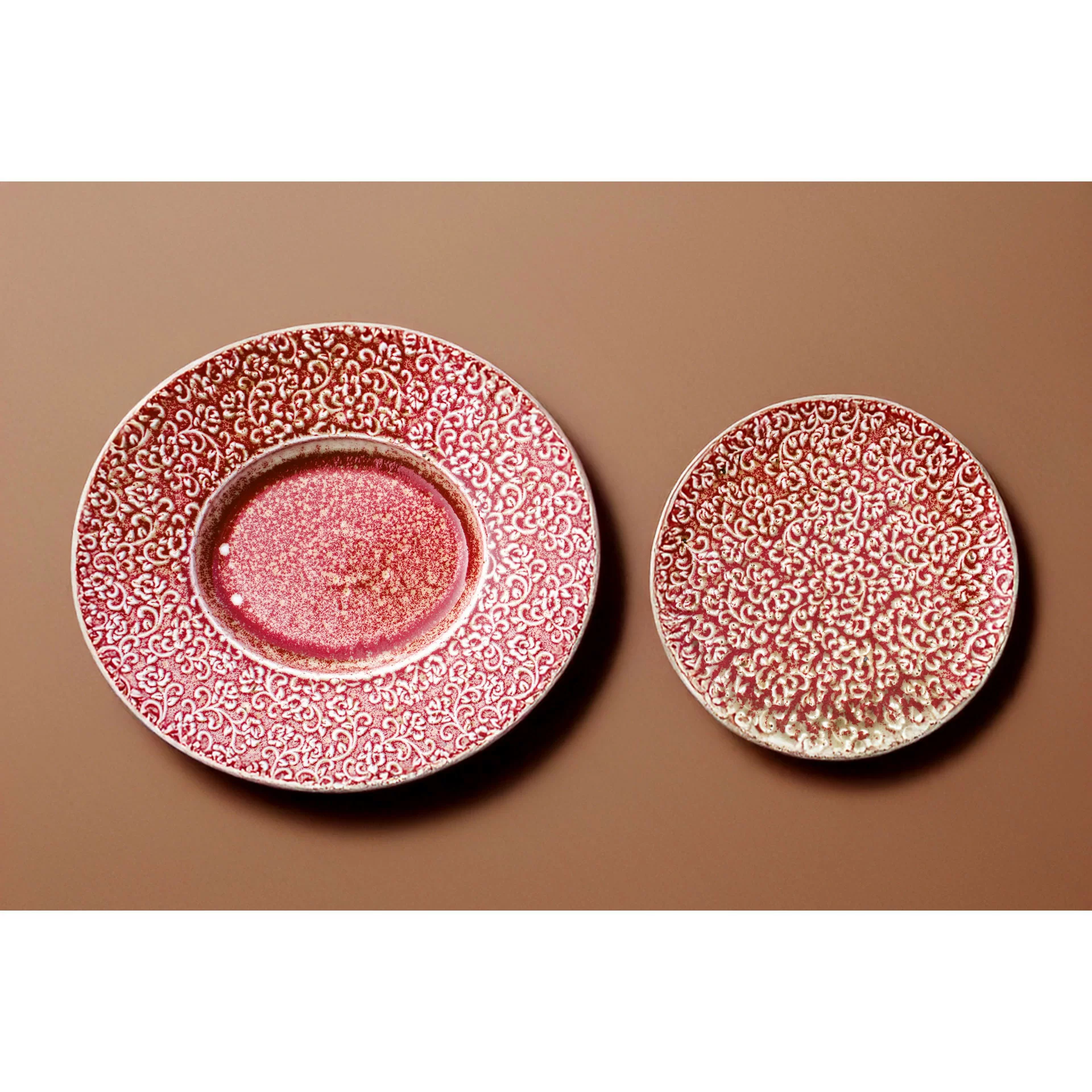 AMOUR Verlo – talerz, który opowiada historię detalu. Talerz porcelanowy AMOUR Verlo to połączenie precyzyjnego rzemiosła z dekoracyjną tradycją. Jego powierzchnię zdobi efektowny relief inspirowany motywem mandali – złożony z powtarzających się, stylizowanych elementów roślinnych. Wzór przyciąga wzrok nie tylko symetrią, ale też subtelną grą kolorów: rdzawa czerwień przenika się z jaśniejszymi, niemal kremowymi akcentami, tworząc bogatą, a jednocześnie harmonijną kompozycję.