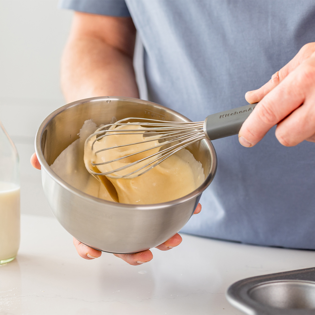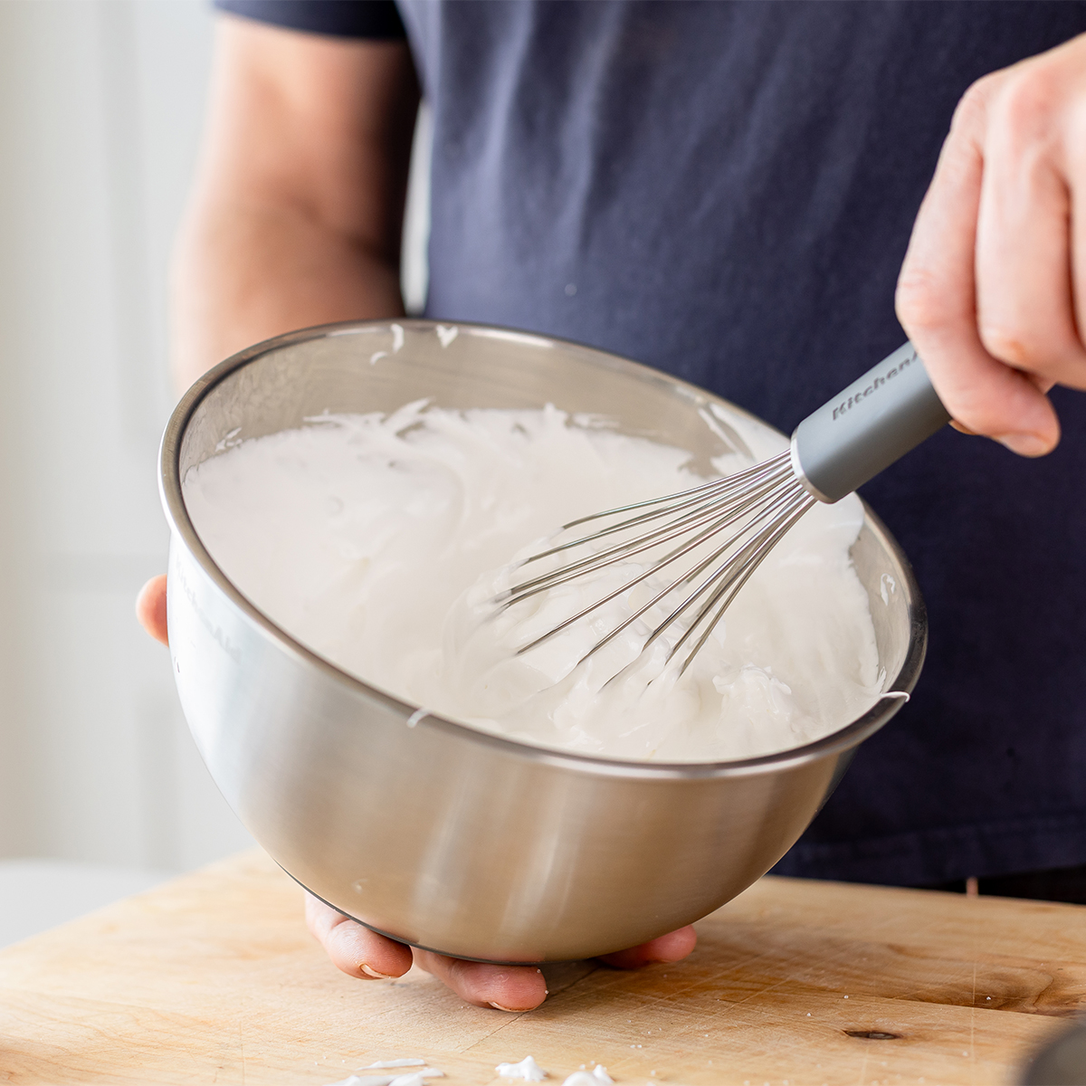 Uniwersalna trzepaczka KitchenAid do mieszania i napowietrzania składników. Sprawdzi się ubijaniu jajek, sosów, bitej śmietanie lub lekkich masach, zapewniając wygodny chwyt i dobrą kontrolę ruchu.